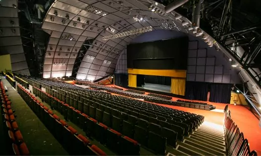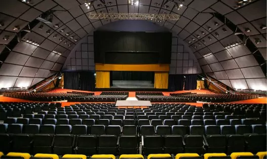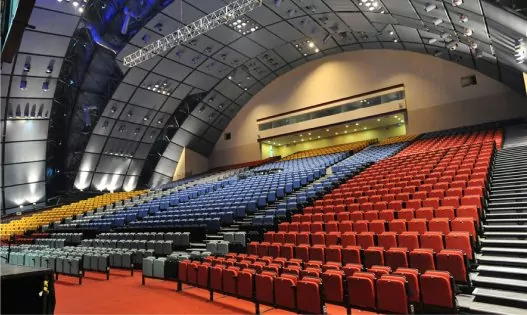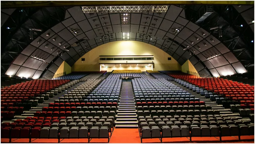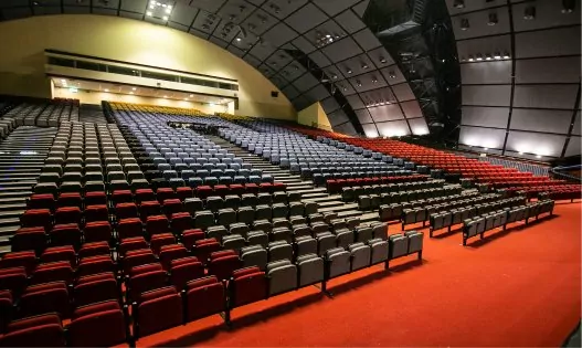 במצב אודיטוריום אנו נקבל מקומות ישיבה של עד 2100 איש ובמה בגודל של 240 מ"ר .צוגים חשמליים , נגישות להכנסת ציוד במה .כשמערך המושבים סגור והרצפה חשופה ניתן לקיים אירועים שונים כגון תערוכות , הפקות , ירידים , מופעים ועוד…